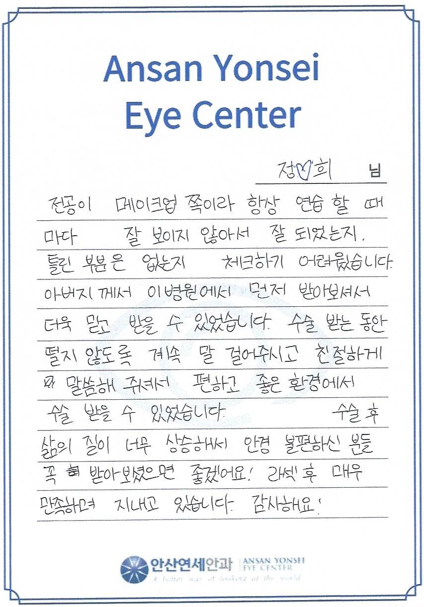 라섹 후 매우 만족하며 지내고 있습니다. 감사해요!