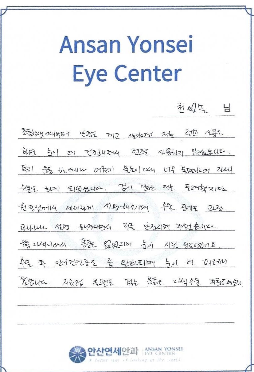 수술 후 안구건조증도 좀 완화되며 눈이 덜 피로해졌습니다.