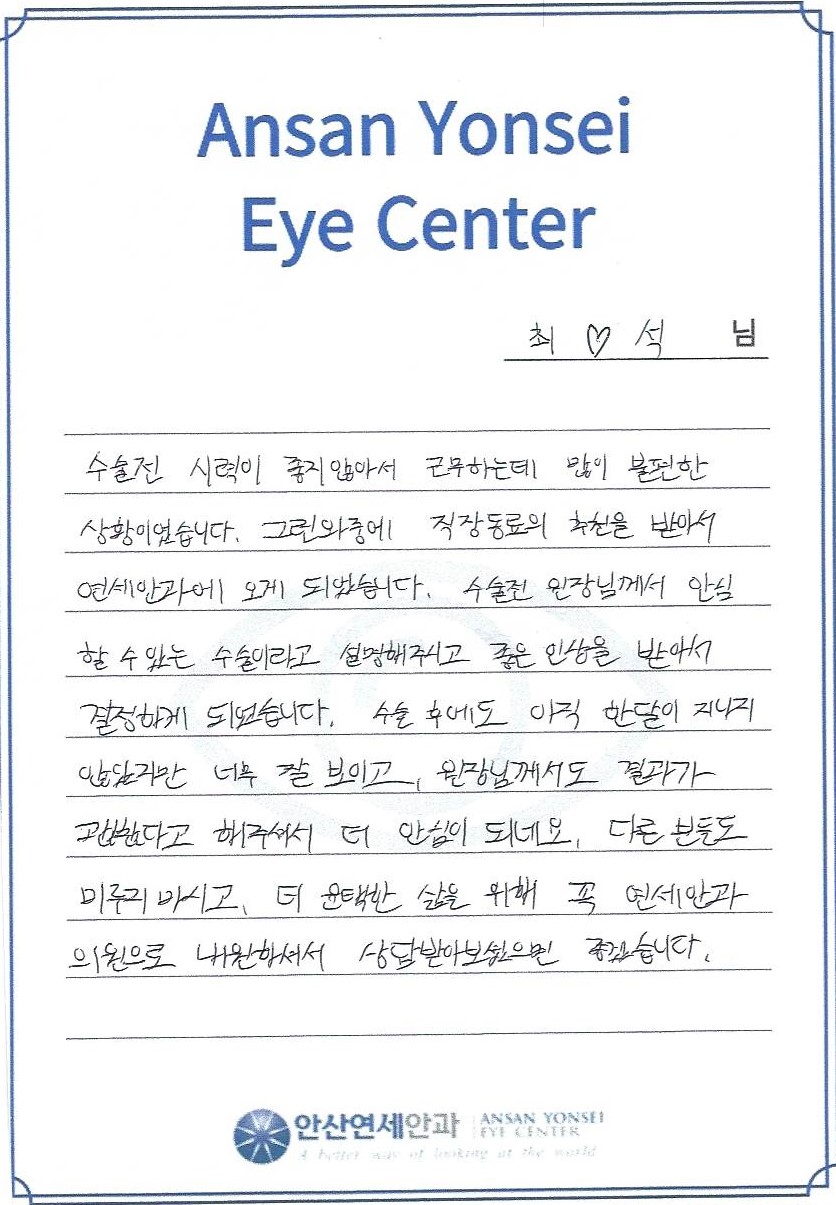 다른 분들도 미루지 마시고, 더 윤택한 삶을 위해 꼭 연세안과의원으로 내원하셔서 상담 받아보셨으면 좋겠습니다.