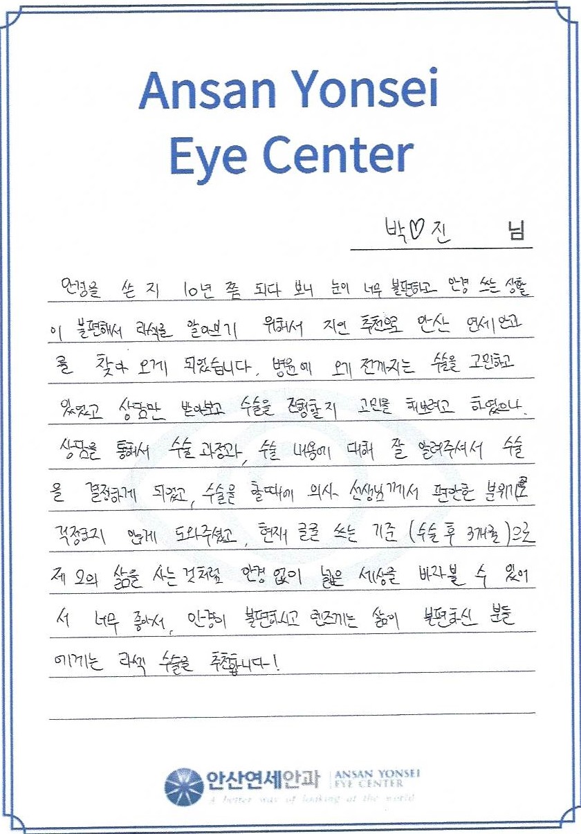 라섹을 알아보기 위해 지인 추천으로 안산 연세안과를 찾아오게 되었습니다.