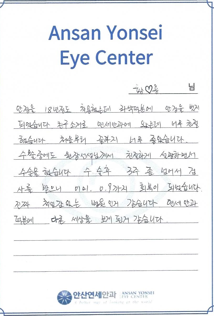 진짜 책임감 있는 병원인거 같습니다. 연세안과 덕분에 다른 세상을 보게 된 것 같습니다.