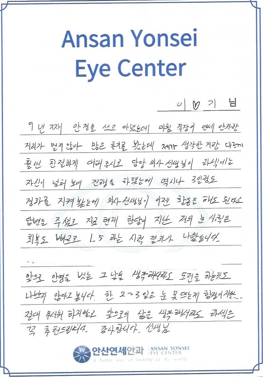 절대 무서워 하지말고 앞으로의 삶을 생각해서라도 라섹은 꼭 추천드립니다. 감사합니다 선생님.