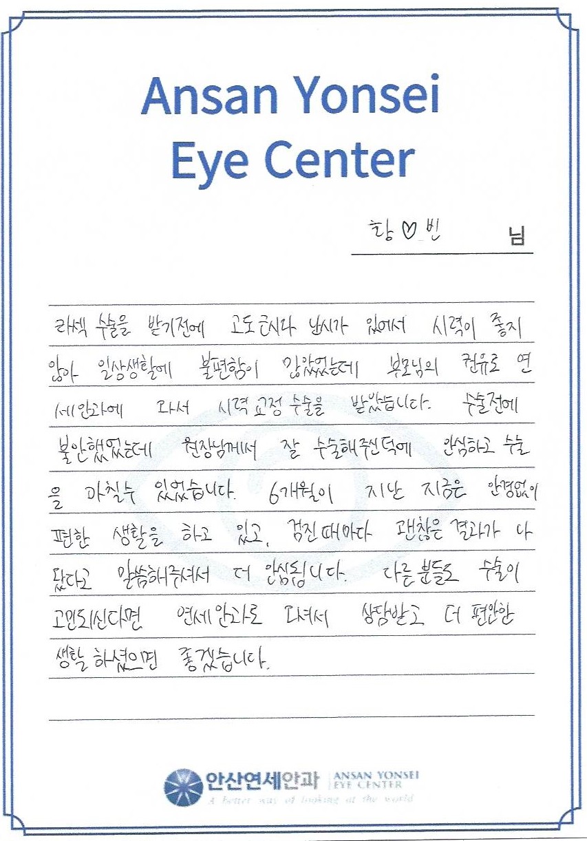 다른 분들도 수술이 고민 되신다면 연세안과로 오셔서 상담 받고 더 편안한 생활하셨으면 좋겠습니다.