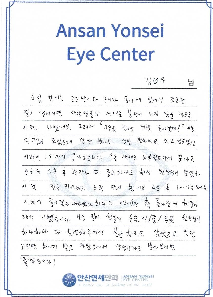 수술 후 1~2주까지는 시력이 좋아졌다 나빠졌다 하다가 어느순간 확 좋아진게 체감이 돼서 기뻤습니다.